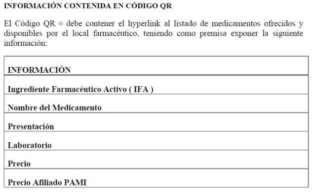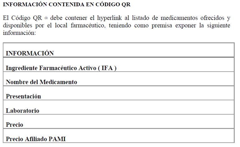 Al mismo tiempo, establece que la lista de precios de las farmacias mediante el código QR en cuanto a su orden y contenido, debe contemplar una serie de requisitos acorde al funcionamiento del buscador de Precios de Medicamentos del Ministerio de Salud de la Nación. Ver buscador