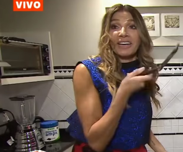 La cámara la toma en primer plano y ahí llega el pie que le brinda el conductor para que pueda explayarse sobre el uso del suplemento dietario Quelat, el que dice le permite tener «ese pelazo«. En el medio también agrega que toma mucha agua y que hay que consultar al médico, diálogo en el que mete su cuña el locutor del programa, a fin de imprimirle la voz oficial a una publicidad televisiva.