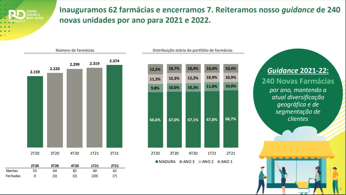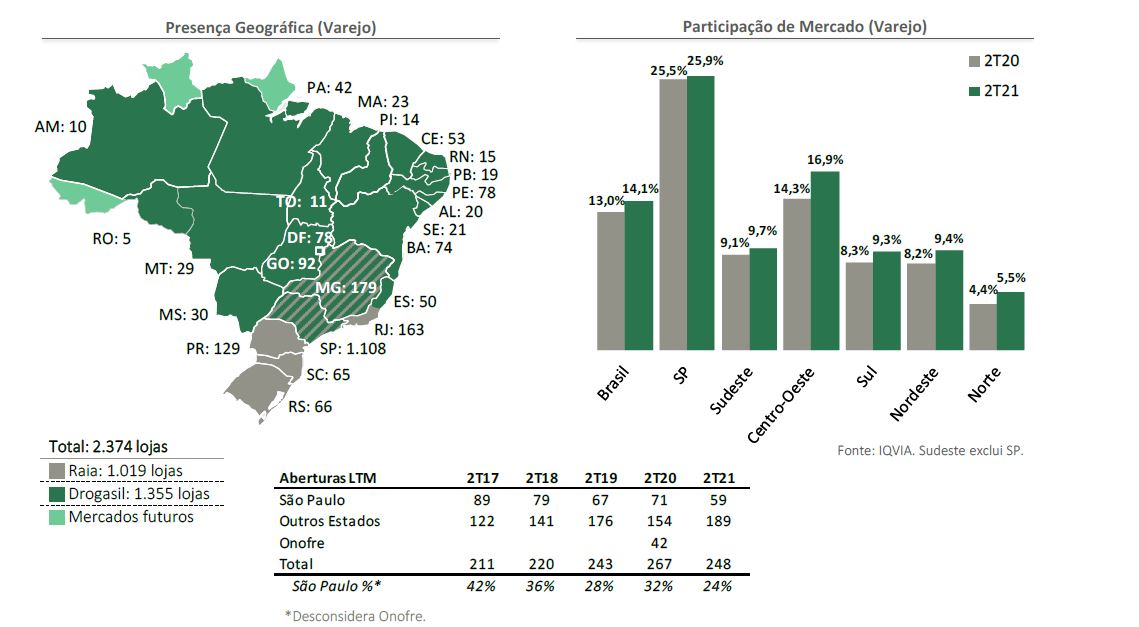La compañía dijo que completó la primera mitad del año con 2.374 farmacias en operaciones, producto de 62 nuevas aperturas y de 7 cierres durante el segundo trimestre. De este total, 1.019 operan bajo la bandera Raia y 1.355 con la marca Drogasil.