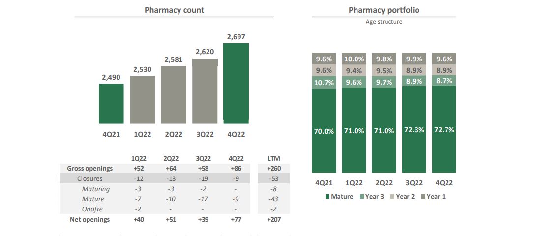 Este sólido desempeño se vio impulsado por la apertura de 260 nuevas farmacias, así como por una performance record de «nuestras tiendas maduras, que crecieron 13,3% en el año, 7,5 puntos porcentuales por encima del IPC«, explicó la compañía.