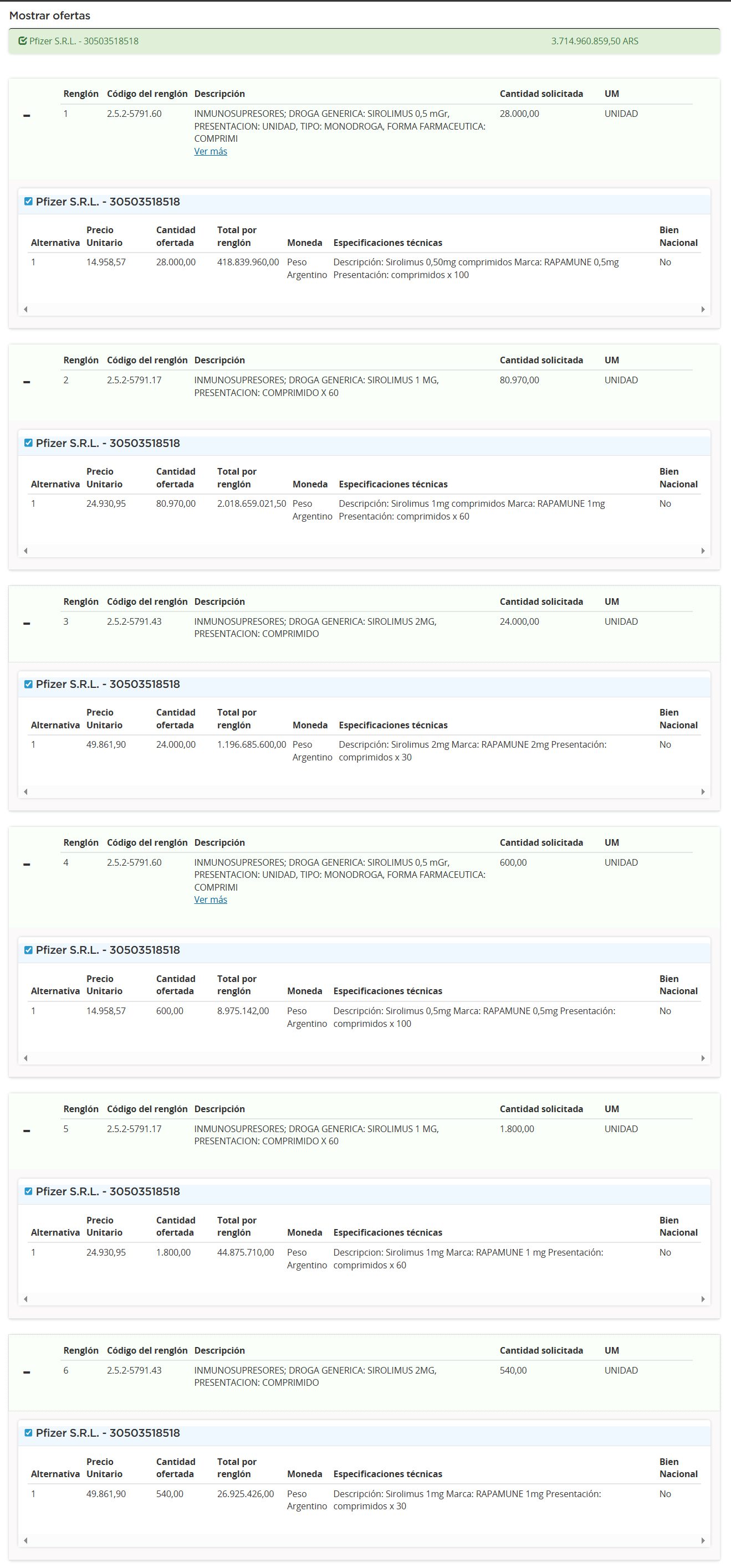 El proceso cuenta con seis renglones, todos por el inmunosupresor a base de sirolimusen diferentes dosis. Los primeros tres detallan partidas dirigidas al Instituto Nacional Central Único Coordinador de Ablación e Implante, INCUCAI. El primero consta de 280 cajas de 100 comprimidos de 0,50 mg; el segundo renglón, de 1350 cajas de 60 comprimidos de 1 mg.; y para el tercero, se requieren 800 cajas de 30 comprimidos de 2 mg.