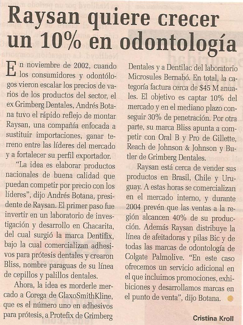 «La idea es elaborar productos nacionales de buena calidad que puedan competir por precio con los líderes», dijo Andrés Botana, presidente de Raysan. El primer paso fue invertir en un laboratorio de investigación y desarrollo en Chacarita, del cual surgió la marca Dentifix, bajo la cual comercializan adhesivos para prótesis dentales y crearon Bliss, nombre paraguas de su línea de cepillos y palillos dentales.