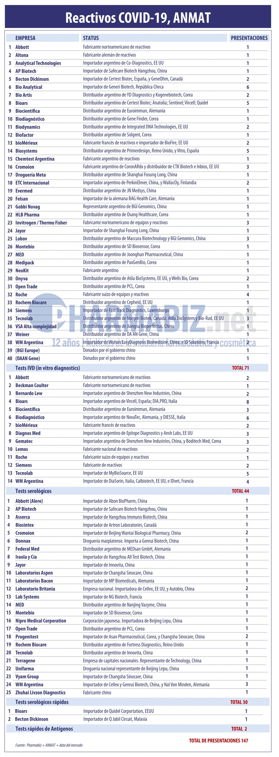 La gran novedad de este último update es la incorporación de la categoría de test rápidos de antígenos, los que se catalogan como de alta sensibilidad y especificidad, y arrojan sus resultados en 15 minutos. Los mismos son utilizados para diagnosticar entre los primeros cinco días, al igual que en el caso de los PCR. Allí se incluyó a la norteamericana Becton Dickinson –cuyo gerente general local es Marco Musitano– que representa a las pruebas de QJabil Circuit de Malasia. También se sumó la nacional Bioars que fue validada para traer al país tests de la norteamericana Quidel.