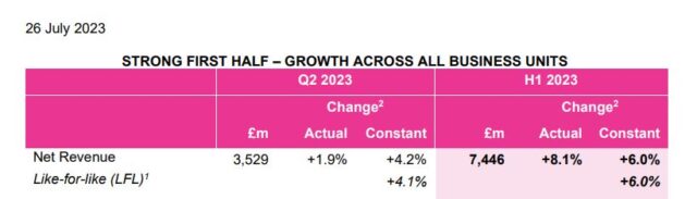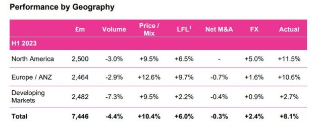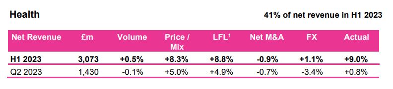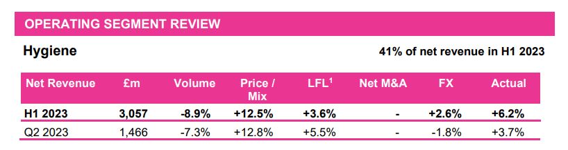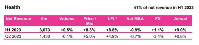 La británica Reckitt cerró el primer semestre del 2023 con ventas globales por £ 7.446 millones (u$s 9.601 millones), lo que le representó una suba del 6,6% like for like. Ver Press Release.