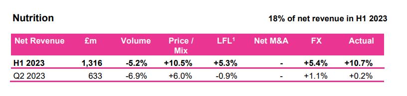 Su segmento de Nutrición marcó un crecimiento interanual del 5,3 con ingresos por £ 1.316 millones (u$s 1.697 millones), con un aporte a la caja del 18%. Esta unidad se vio impulsada por una participación de mercado que continúa siendo sólida en América del Norte y el crecimiento de un dígito medio en LATAM.