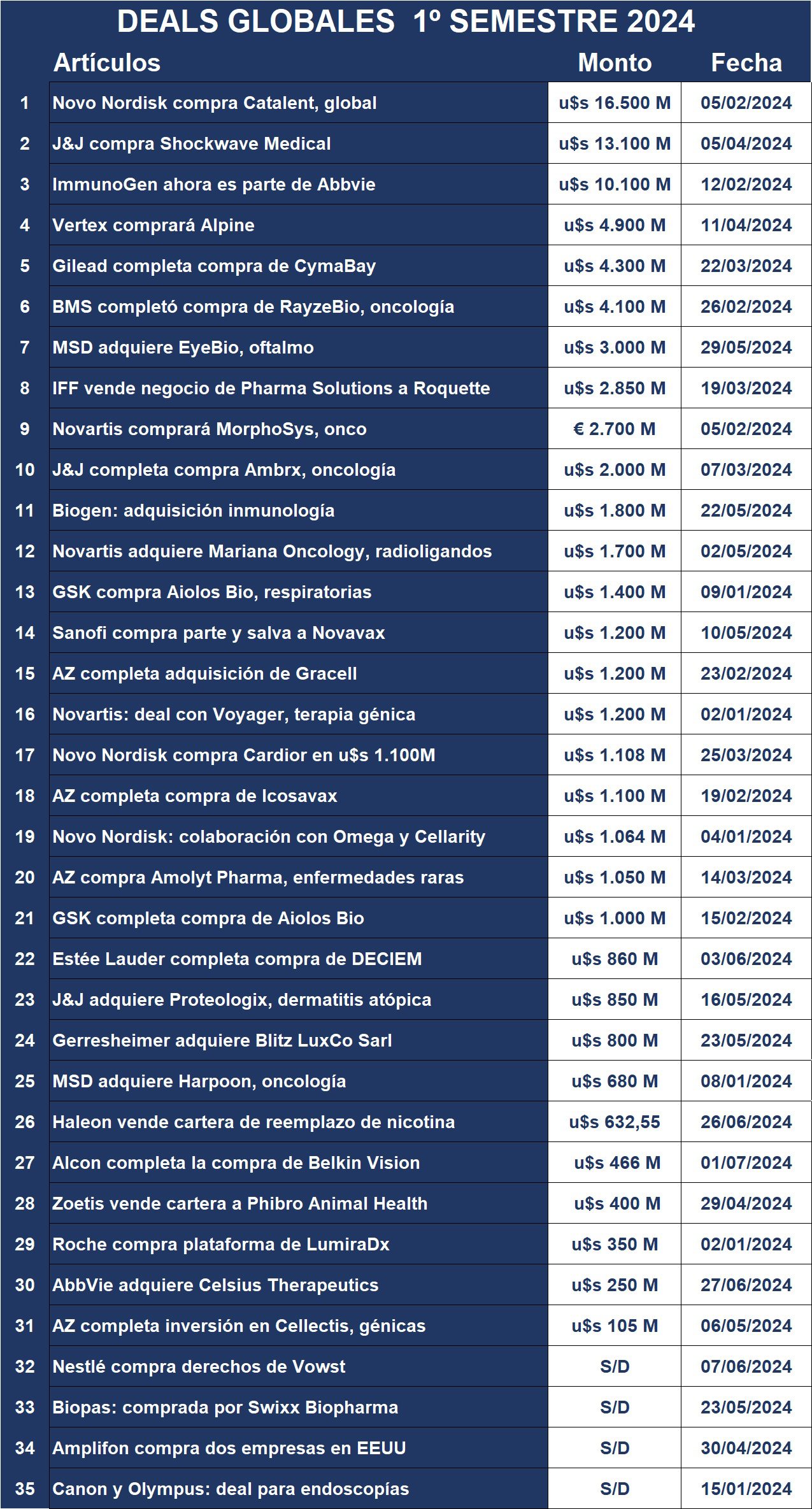Otro de los deals de farma más relevantes del semestre fue el encabezado por la norteamericana Abbvie, que completó la adquisición de ImmunoGen, proceso que inició en noviembre de 2023. Se trata de una empresa connacional enfocada en el segmento de la oncología, y más precisamente en los ADC. Su principal diferencial es Elahere, un medicamento para cáncer de ovario. Ver Compra ImmunoGen