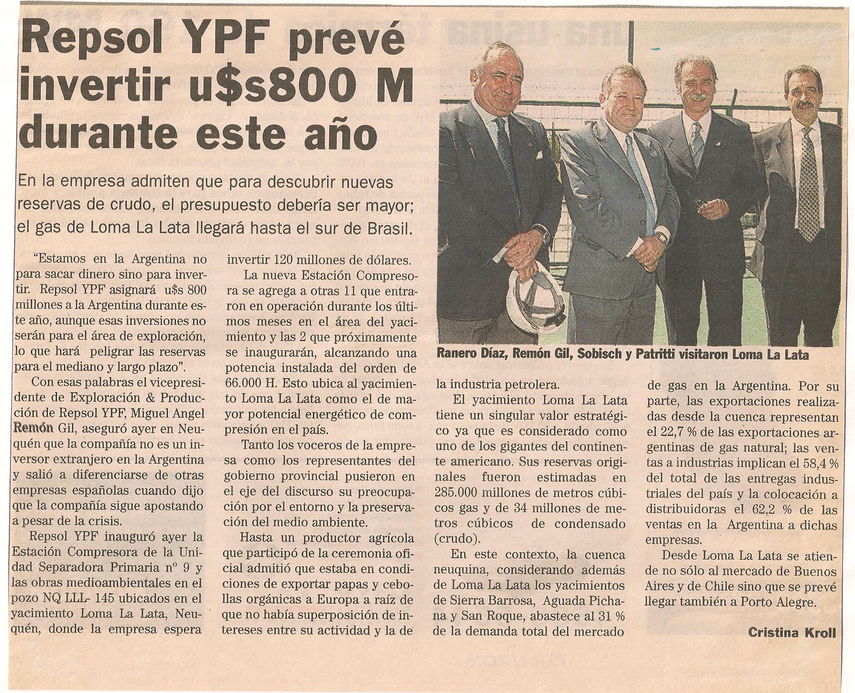«Estamos en la Argentina no para sacar dinero sino para invertir. Repsol YPF asignará u$s 800 millones a la Argentina durante este año, aunque esas inversiones no serán para el área de exploración, lo que hará peligrar las reservas para el mediano y largo plazo«.