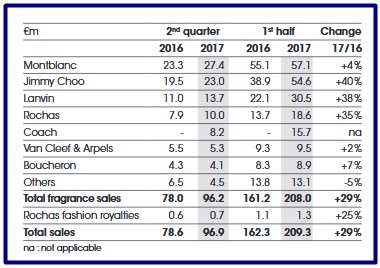 Su negocio de Fragancias escaló un 29%. Dentro de esta unidad la marca que estuvo a la cabeza fue Jimmy Choo, con un incremento en su facturación del 40%. Le siguió de cerca Lanvin con un 38%, y Rochas con un 35%. Ver press release.