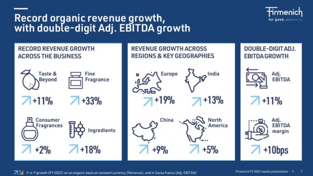 La suiza Firmenich, experta en aromas y esencias, informó los resultados correspondientes a su año fiscal cerrado el 30 de junio de 2022. Sus ventas crecieron un 11,1% interanual a 4.723 millones de francos suizos (u$s 4.927 millones) en términos orgánicos y a moneda constante. Ver press release.