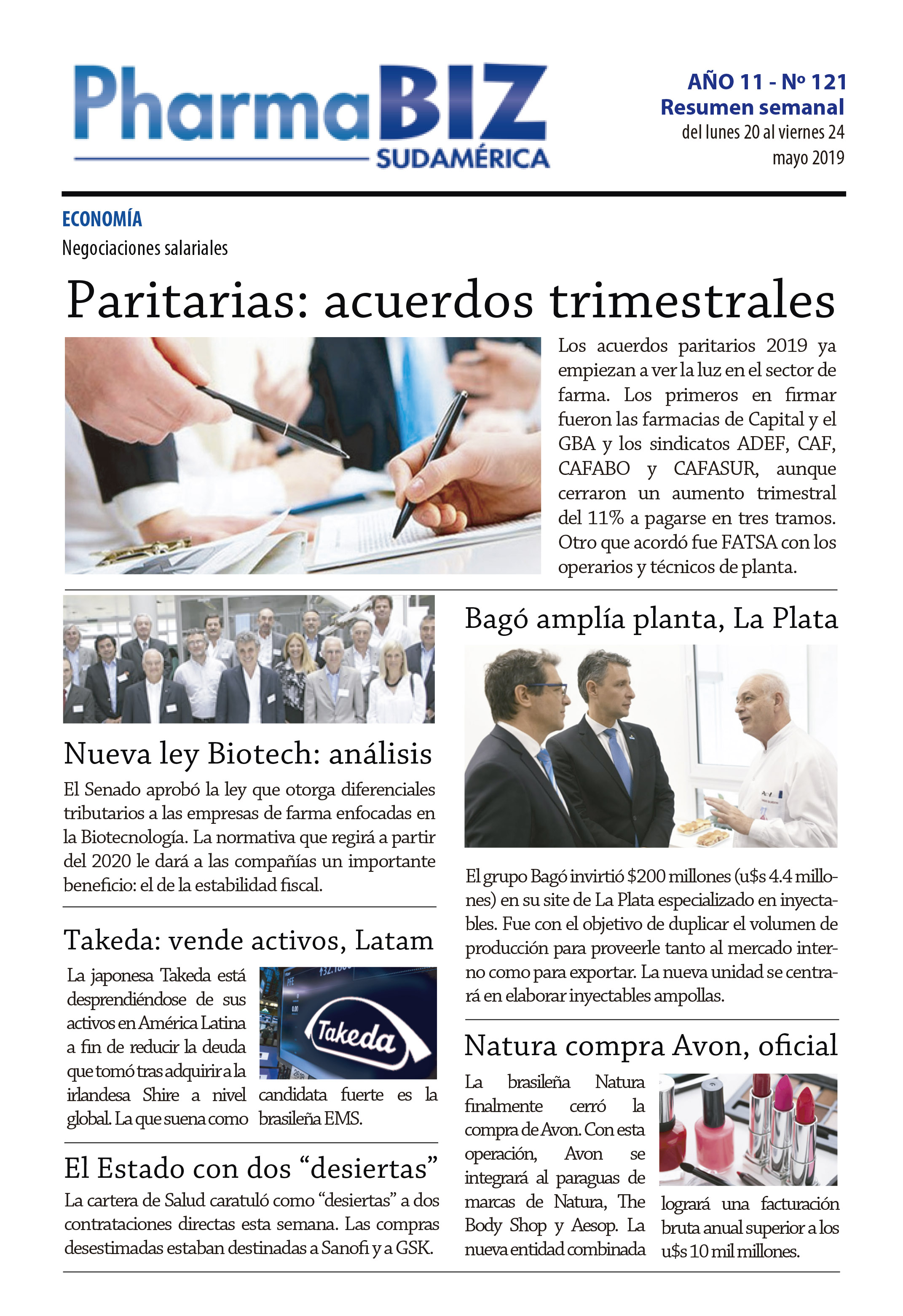 En esta semana el tema paritarias sigue dando tela para cortar. Durante el período también estuvo en tapa la inversión industrial que realizó el grupo Bagó en su planta de La Plata, así como la adquisición de Avon por parte de Natura, entre otras noticias relevantes.