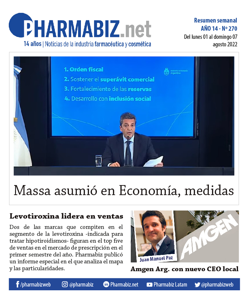 La levotiroxina, en tanto, se constituyó en protagonista mediante un informe especial elaborado por Pharmabiz, ya que se trata de uno de los principios activos más indicados en el mercado argentino. Dos de las marcas que compiten en el segmento –T4 Montpellier, del laboratorio nacional, y Levotiroxina GSK, de la firma británica– figuran en el top five de ventas en el mercado de prescripción en el primer semestre del año, según datos de IQVIA. Ver artículo Levotiroxina.