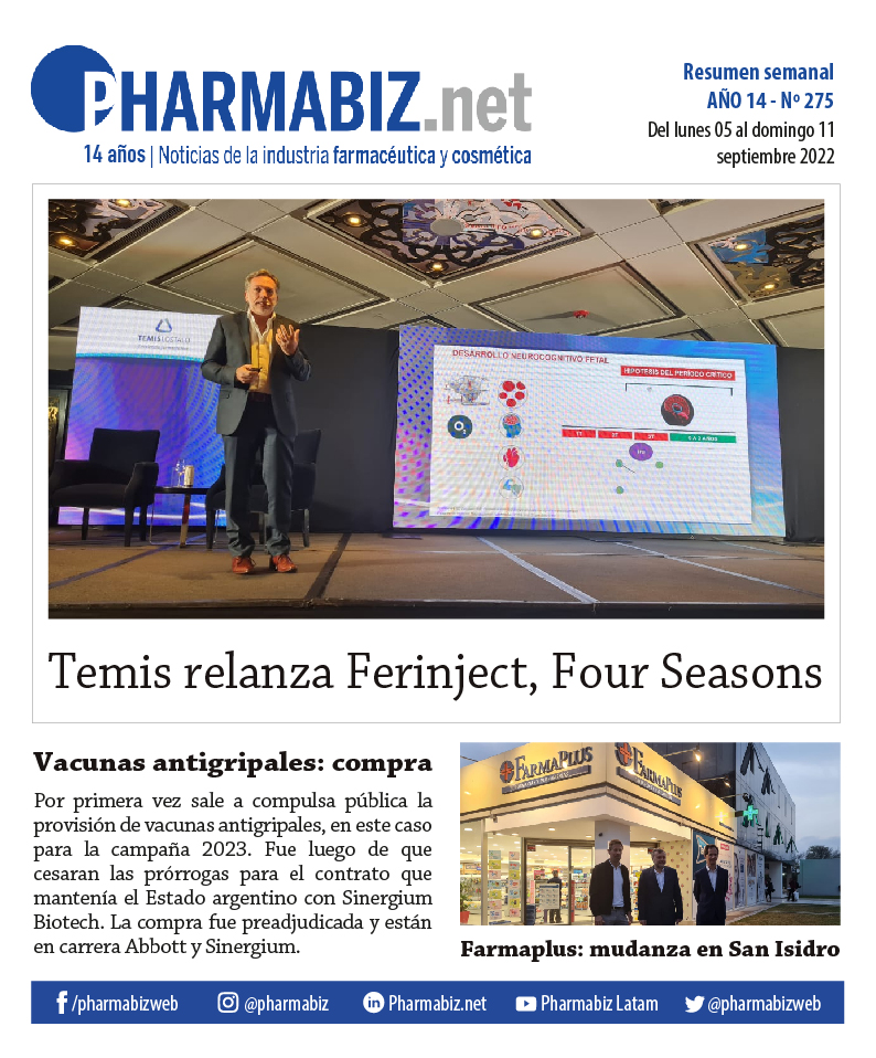En la semana se llevaron a cabo diferentes eventos presenciales. El laboratorio nacional Temis Lostaló llevó a cabo el relanzamiento de Ferinject en el Four Seasons. Se trata de un antianémico de la suiza Vifor, y cuya marca forma parte del portafolio de la firma nacional. La reunión, a la que estuvieron invitados ginecólogos y hematólogos, tuvo como disertantes a Pablo Carpintero, director médico del Instituto Ginecológico Bs. As. (IGBA); y a María Cecilia Braxs, jefa del servicio de Hematología de la Clínica Universitaria Reina Fabiola. Ver artículo Temis.