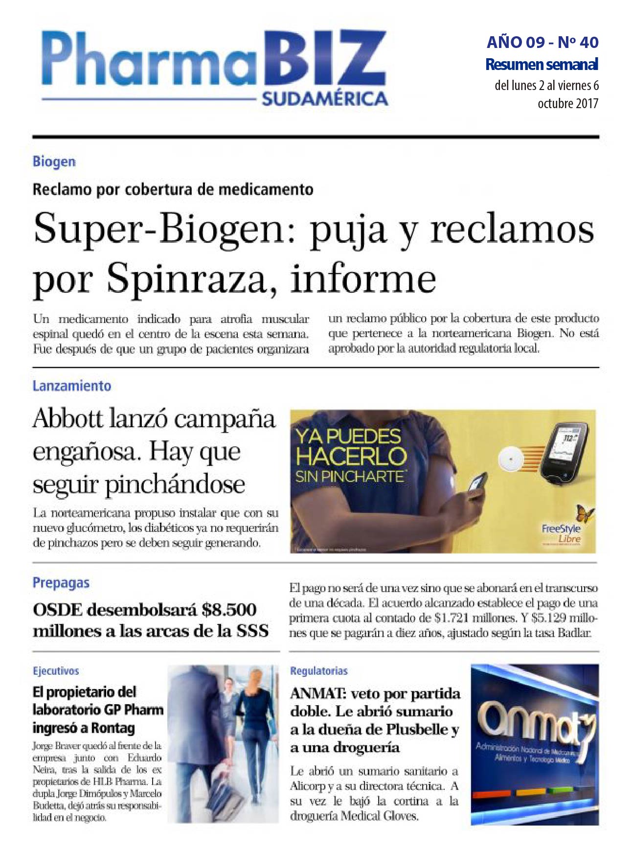 Otro tema que quedó en el foco de la arena pública esta semana fue el que tuvo como protagonista a Spinraza, un producto para tratar la atrofia muscular espinal, propiedad de la norteamericana Biogen. Fue en función de que un grupo de pacientes organizó un reclamo público por la completa cobertura por parte fundamentalmente de las prepagas y de las obras sociales provinciales. El innovador producto, todavía no está aprobado por la ANMAT. Ver artículo