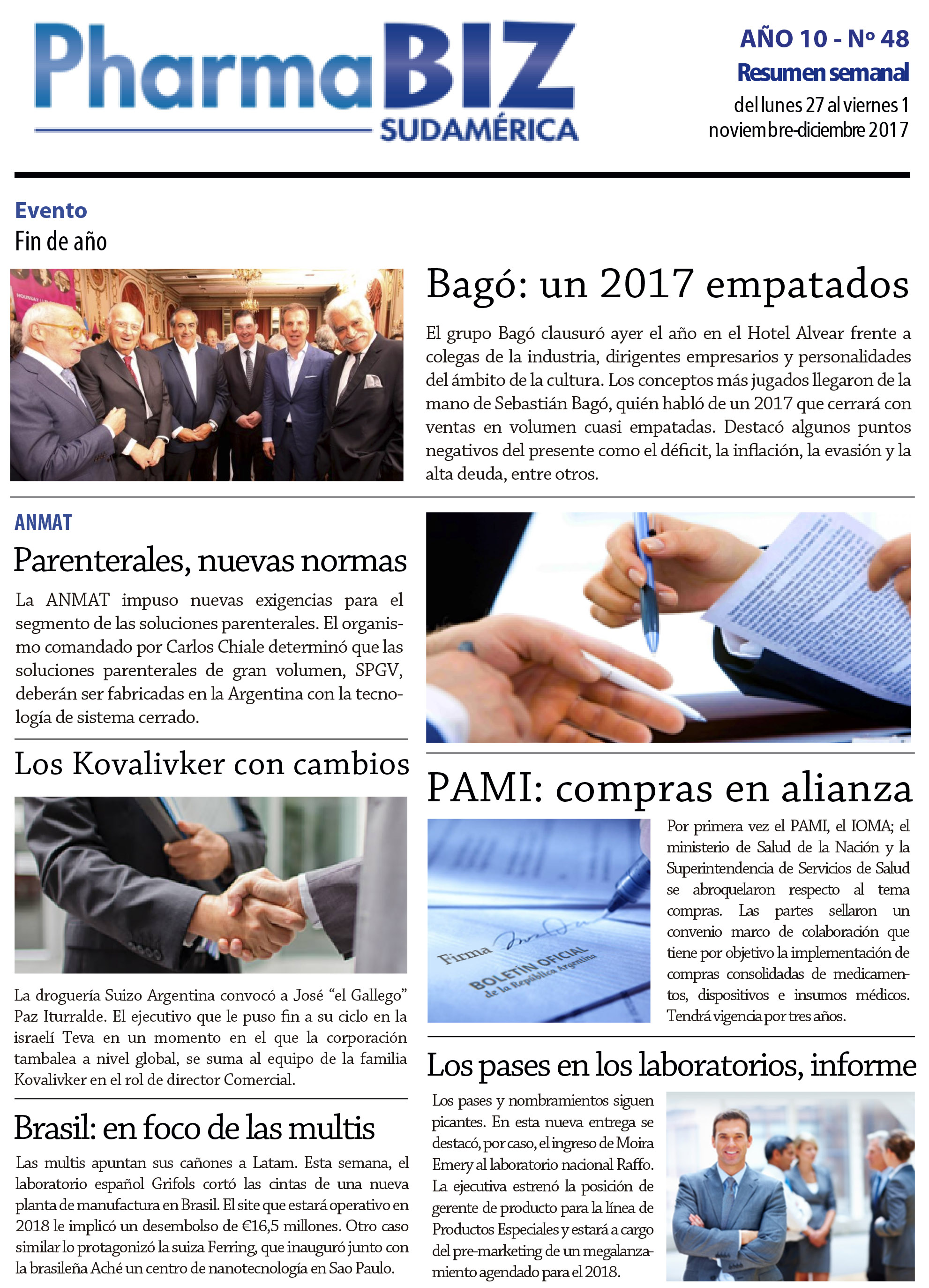 La ANMAT también estuvo en tapa esta semana luego de imponer nuevas exigencias para el segmento de las soluciones parenterales de gran volumen. Las mismas deberán ser fabricadas en la Argentina con la tecnología de sistema cerrado. Las empresas que no lo tengan operativo están conminadas a invertir y migrar hacia ese sistema en un plazo que no podrá exceder los dos años. Ver artículo.