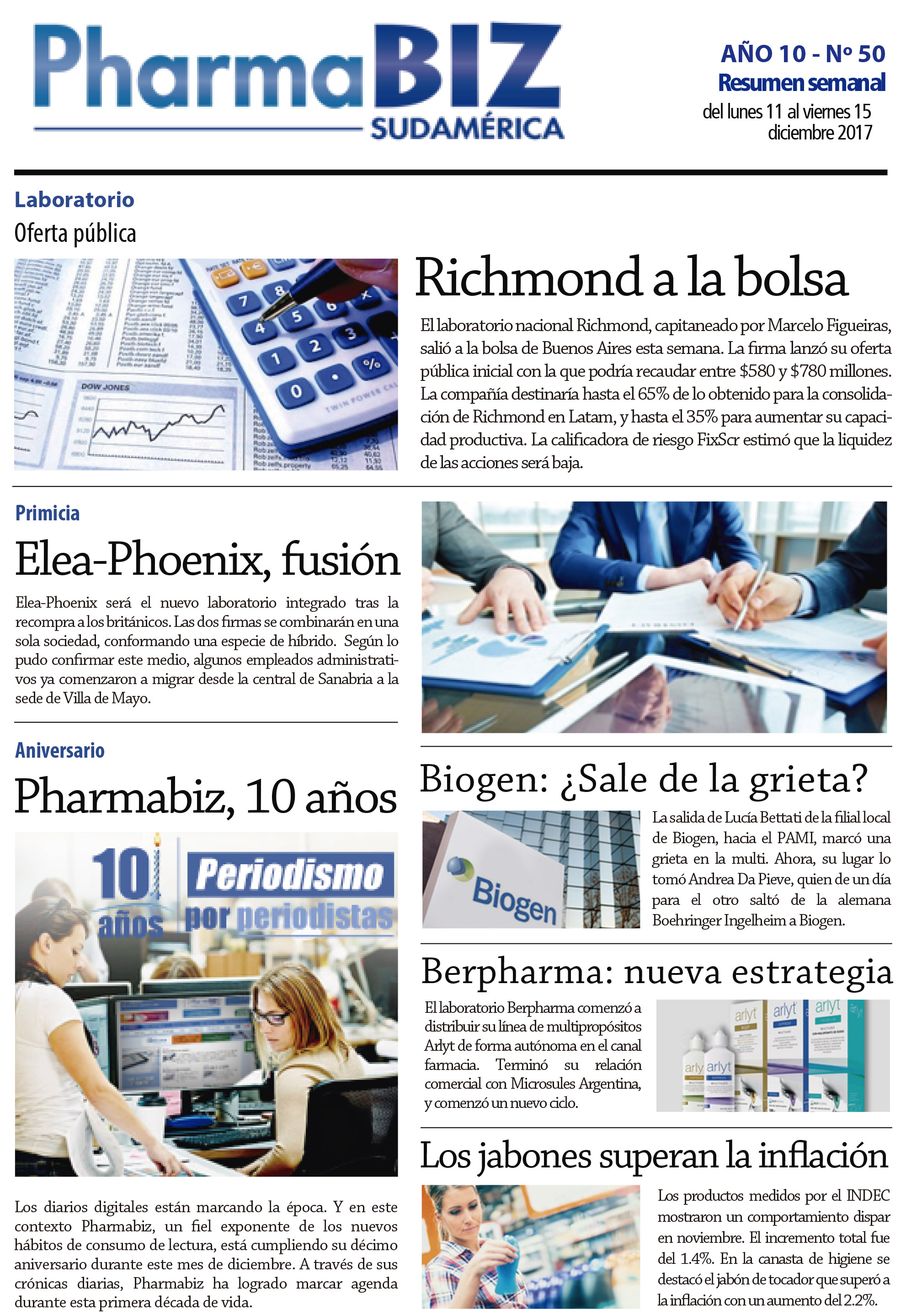 En estos 10 años Pharmabiz puso en tapa decenas de primicias de envergadura. Bajo este concepto de inmediatez, esta semana logramos poner en tapa otro adelanto que tuvo como protagonista al nacional Elea. Tras la compra a los británicos, el grupo -comandado por Daniel Sielecki, Hugo Sigman y Luis Gold– se combinará bajo una misma razón social para salir al mercado con el nombre de Elea-Phoenix. Ver artículo.