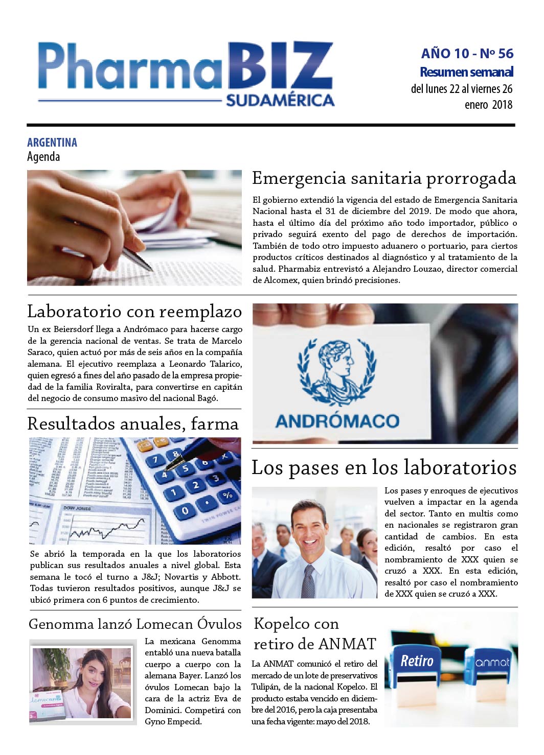 En materia regulatoria, la ANMAT estuvo en tapa luego de informar acerca del retiro del mercado de un lote de preservativos Tulipán, de la nacional Kopelco. Los productos habían vencido en 2016 pero la caja presentaba una fecha vigente, mayo del 2018. Ver artículo