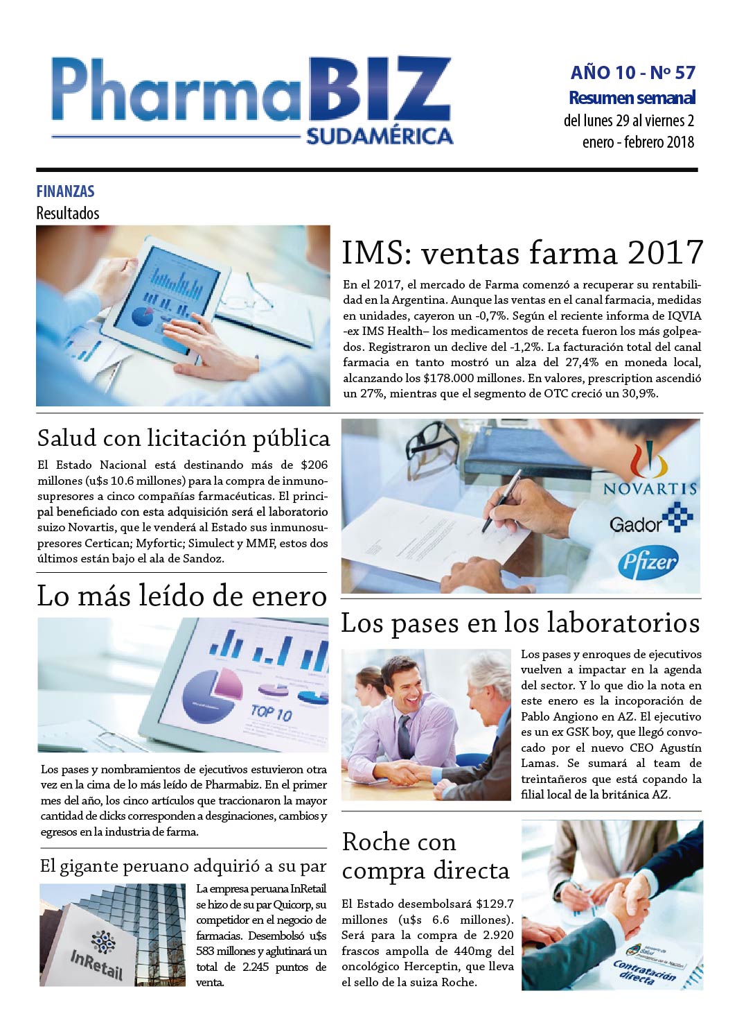 Otro tema que estuvo en tapa esta semana fue la nueva licitación pública aprobada por el Ministerio de Salud de la Nación. A través de la decisión administrativa 36, el Estado Nacional está destinando más de $206 millones (u$s 10.6 millones) para la compra de inmunosupresores a cinco compañías farmacéuticas. El principal beneficiado con esta adquisición será el laboratorio suizo Novartis, que le venderá al Estado sus marcas Certican; Myfortic; Simulect y MMF, estos dos últimos están bajo el ala de Sandoz. Ver artículo.
