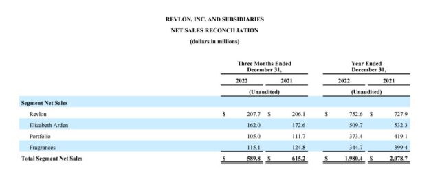 La estadounidense Revlon finalizó su ejercicio económico 2022 con una caída del -4,7% en sus ventas netas consolidadas. Los ingresos totalizaron u$s 1.980,4 millones, un descenso de u$s 98,3 millones frente a los u$s 2.078,7 millones que obtuvo en 2021. Ver Press Release.