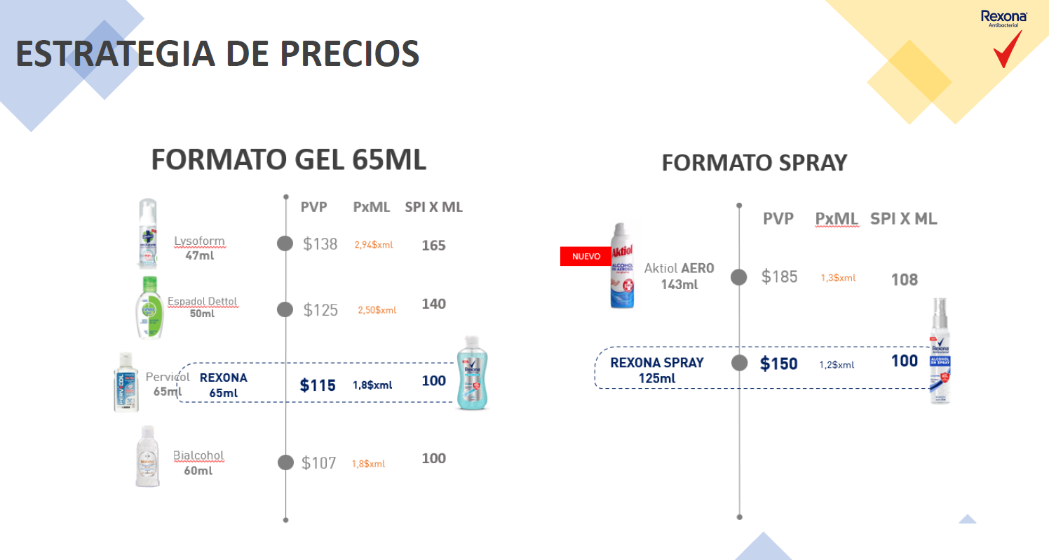 La corporación está implementando una estrategia de precios muy agresiva que espera darle en el blanco a marcas como Pervicol, de Elea Phoenix y a la recientemente lanzada Aktiol del grupo Queruclor. Su mini alcohol en gel de 65 ml. se comercializará a $115 (u$s 1,63), en la misma franja de precio que Pervicol. Quedará a su vez por debajo de los sugeridos de sus rivales multinacionales: Espadol Dettol, de la británica Reckitt Benckiser; y Lysoform, de la norteamericana SC Johnson. Ver infografía.