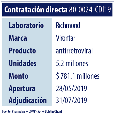 El Estado adjudicó esta semana una Contratación Directa por Exclusividad al laboratorio nacional Richmond. Fue para adquirir 5.2 millones de unidades de dos presentaciones de su antirretroviral Virontar por $781.1 millones (u$s 17.3 millones).