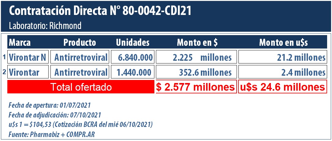 El Ministerio de Salud de la Nación adjudicó una contratación directa «por exclusividad» que tiene como único ganador al laboratorio nacional Richmond, con su producto Virontar, para HIV. Ver adjudicación
