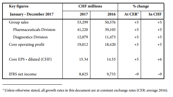 Las ventas del grupo Roche estuvieron más que parejas para todos sus negocios durante el 2017. Sus ventas finales crecieron un 5% y el mismo resultado mostraron tanto su división de Pharma como su división de Diagnóstica. Ver press release