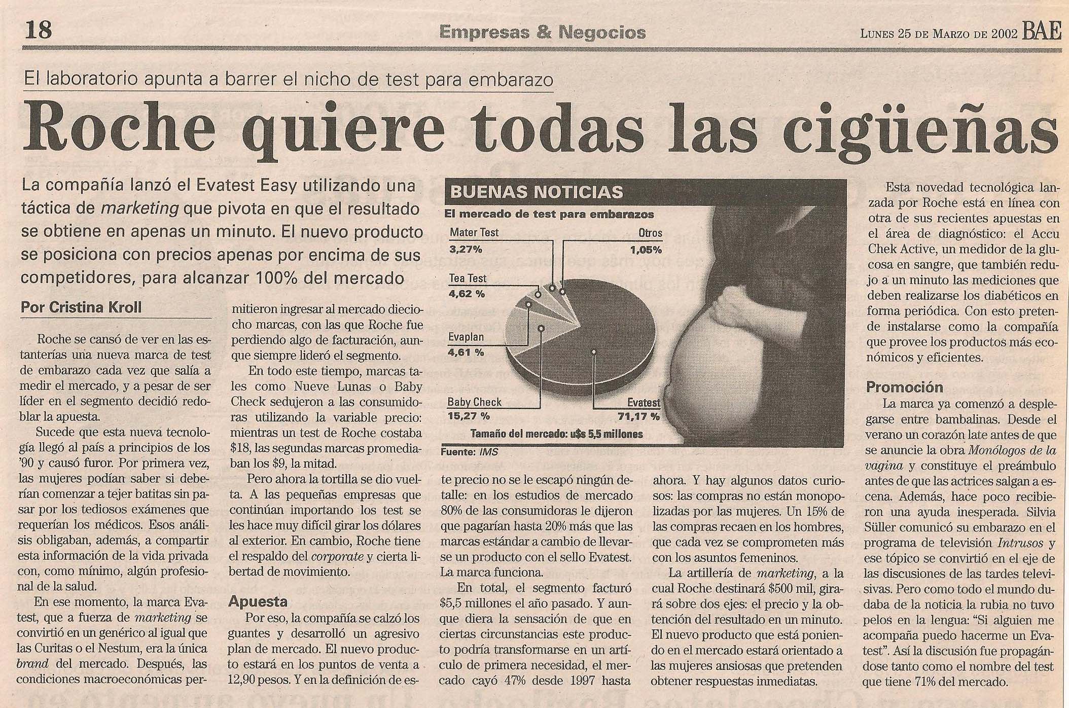 En ese momento, la marca Evatest, que a fuerza de marketing se convirtió en un genérico al igual que las Curitas o el Nestum, era la única brand del mercado. Después, las condiciones macroeconómicas permitieron ingresar al mercado dieciocho marcas, con las que Roche fue perdiendo algo de facturación, aunque siempre lideró el segmento.