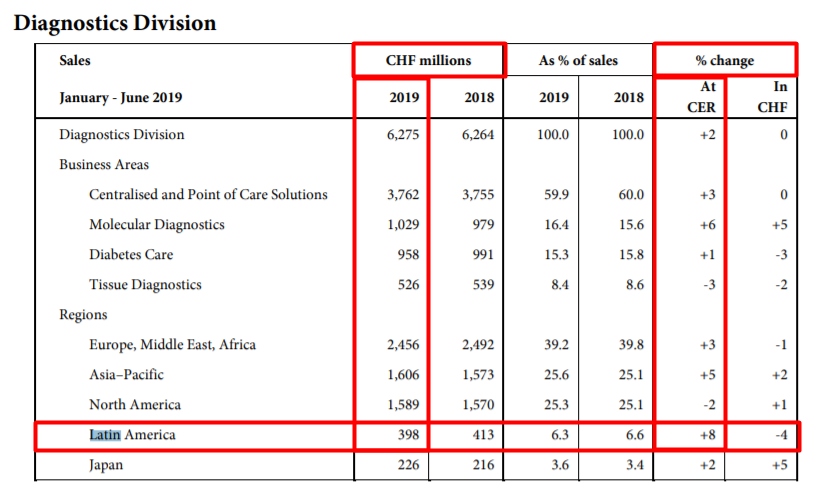 En el informe Roche destacó que la región que mostró su mejor cara en Diagnostics fue América Latina con una suba del 8%; en segundo lugar se ubicó Asia-Pacífico con un aumento del 5%; seguido por Europa, Medio Oriente y África con un 3%; y por último Norteamérica y Japón ambos con un incremento del 2%.