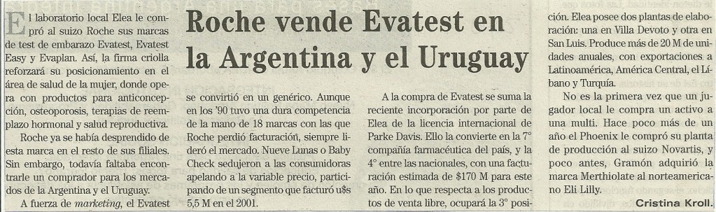 El laboratorio local Elea le compró al suizo Roche sus marcas de test de embarazo Evatest, Evatest Easy y Evaplan. Así, la firma criolla reforzará su posicionamiento en el área de salud de la mujer, donde opera con productos para anticoncepción, osteoporosis, terapias de reemplazo hormonal y salud reproductiva.