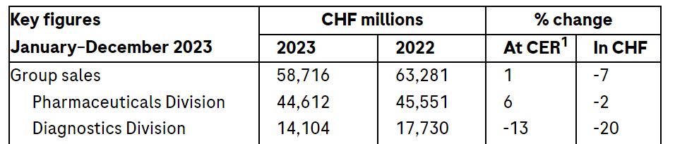 La suiza Roche publicó su reporte financiero correspondiente al 2023. A pesar de una caída en la venta de productos relacionados con el COVID-19 en sus dos divisiones, la facturación de la multi creció un 1% en moneda constante frente al 2022 al totalizar 58.716 M de francos suizos (u$s 68.137 millones).