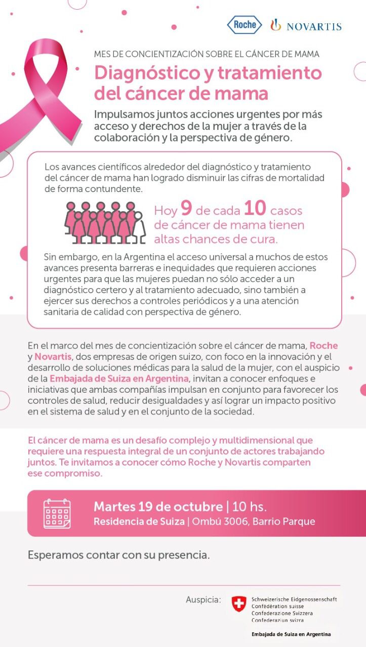 Dos laboratorios suizos realizaron hoy una convocatoria en la Embajada de Suiza en la Argentina. Fue para pasar revista al status del cáncer de mama y las perspectivas a nivel local. Estuvieron presentes las CEOs locales de Roche y Novartis, junto a Rubén Torres, quien definió al sistema de atención de la salud argentino como primitivo.