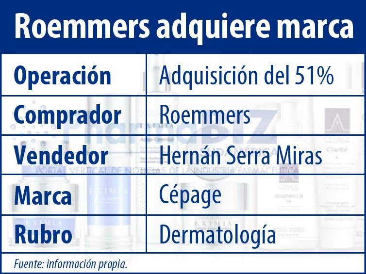 El grupo Roemmers quiere avanzar en el negocio de Dermatología. Según pudo saber Pharmabiz la compañía está adquiriendo el 51% de la empresa local Cépage. Sumará la marca a su negocio encabezado por Eximia.