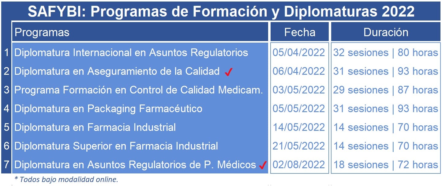 Esta propuesta se complementará con la «Diplomatura en aseguramiento de la calidad en la industria farmacéutica«, cuya primera edición se estrena en este 2022. El plan incluye 31 encuentros online desde el próximo miércoles 6 de abril los que se extenderán hasta mediados del mes de noviembre. Esta diplomatura se propone aportar herramientas de gestión y habilidades que le permitan alcanzar un mayor nivel de especialización en lo relativo al Aseguramiento de la Calidad. El dictado del curso estará bajo la dirección de Cecilia Sobrero y de Hugo Calandriello. Participarán como oradores autoridades sanitarias, y expertos de Aseguramiento de la Calidad, Tecnología Farmacéutica, Ingeniería y Química Analítica de SAFYBI. Ver Diplomatura en Aseguramiento de la Calidad en la Industria Farmacéutica.