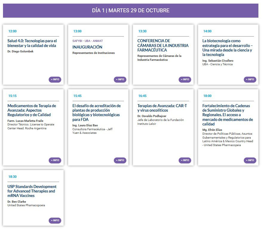 La disertación siguiente será Terapias de Avanzada: CAR-T y virus oncolíticos, encabezada por Osvaldo Podhajcer, jefe de laboratorio de la Fundación Instituto Leloir. Además, habrá charlas sobre el Fortalecimiento de Cadenas de Suministro Globales y Regionales, a cargo de Efrén Elías, director de Políticas Públicas, Asuntos Gubernamentales y Regulatorios para Latino América & Mexico Country Head de la farmacopea de los Estados Unidos; y de Ben Clarke, de la USP, quien disertará sobre los standards de desarrollo de la USP para terapias avanzadas.