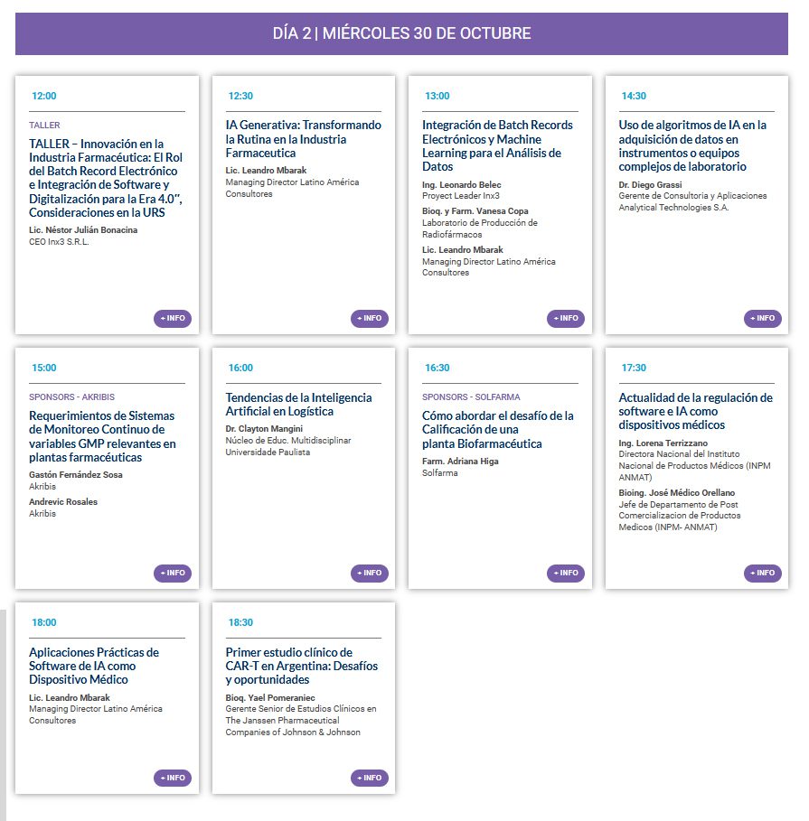 El miércoles 30 de octubre, Néstor Bonacina, CEO de Inx3, se pondrá al frente de un taller sobre el rol del batch record electrónico e integración de software y digitalización. Más tarde el managing director de Latino América Consultores Leandro Mbarak llevará a cabo la charla titulada IA Generativa: Transformando la Rutina en la Industria Farmacéutica. A continuación, se volverá a retomar el tema de los batch records y machine learning en el análisis de datos, a cargo del líder de Proyecto de Inx3 Leonardo Belec, la bioquímica y farmacéutica Vanesa Copa y Mbarak. La reunión posterior será Uso de algoritmos de IA en la adquisición de datos en instrumentos o equipos complejos de laboratorio, al mando del gerente de consultoría y aplicaciones de Analytical Technologies Diego Grassi.