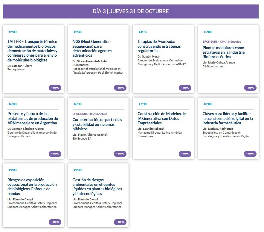 Las última cinco charlas del jueves serán Construcción de Modelos de IA Generativa con Datos Empresariales, todo a cargo de Leandro Mbarak. Posteriormente, llegará la cita para Claves para liderar y facilitar la transformación digital en la industria farmacéutica, bajo María Rodriguez, especialista en comunicación estratégica y transformación digital. Tras esto el micrófono será para una doble charla a cargo de Eduardo Campi, gerente de Soporte Regional de Medio Ambiente, Salud y Seguridad en la norteamericana Abbott. La primera versará sobre Riesgos de exposición ocupacional en la producción de biológicos, enfoque de bandas y la segunda será sobre Gestión de riesgos ambientales en efluentes líquidos en plantas biológicas y biotecnológicas.