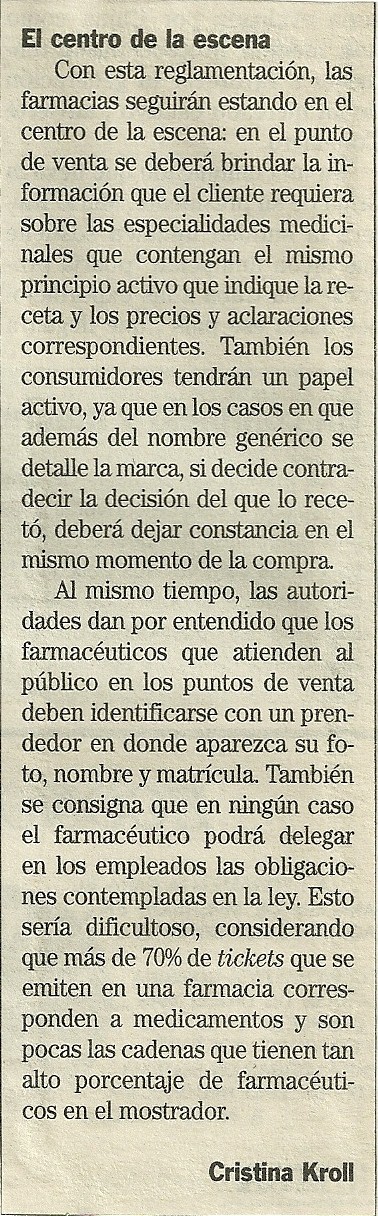 Con esta reglamentación, las farmacias seguirán estando en el centro de la escena: en el punto de venta se deberá brindar la información que el cliente requiera sobre las especialidades medicinales que contengan el mismo principio activo que indique la receta y los precios y aclaraciones correspondientes. También los consumidores tendrán un papel activo, ya que en los casos en que además del nombre genérico se detalle la marca, si decide contradecir la decisión del que lo recetó, deberá dejar constancia en el mismo momento de la compra.