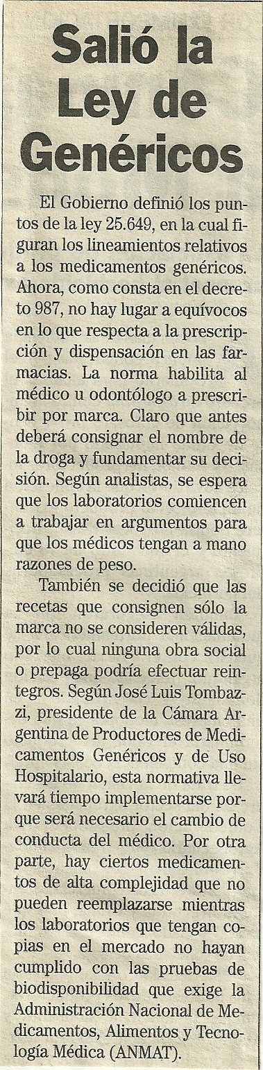 El Gobierno definió los puntos de la ley 25.649, en la cual figuran los lineamientos relativos a los medicamentos genéricos. Ahora, como consta en el decreto 987, no hay lugar a equívocos en lo que respecta a la prescripción y dispensación en las farmacias. La norma habilita al médico u odontólogo a prescribir por marca. Claro que antes deberá consignar el nombre de la droga y fundamentar su decisión. Según analistas, se espera que los laboratorios comiencen a trabajar en argumentos para que los médicos tengan a mano razones de peso.