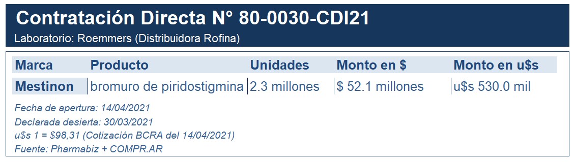 En esta segunda semana de abril, el Estado Nacional reabrió una contratación directa que quedó desierta el mes pasado. La misma apunta a adquirir un anticolinérgico del grupo Roemmers. Ver contratación directa.