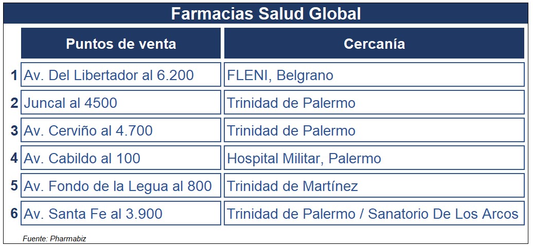 Con estas inauguraciones, la empresa consolida su estrategia de generar locales ubicados en las cercanías de instituciones médicas, a fin de ser sinérgicos. La firma cuenta con otras cuatro farmacias, tres de ellas ubicadas en la Ciudad de Buenos Aires y una en el GBA norte. Las mismas están emplazadas en Cabildo al 100, en la zona del Hospital Militar; en Cerviño al 4700, a metros de la Trinidad de Palermo; en Santa Fe al 3900, también cerca de la Trinidad de Palermo y del Sanatorio De los Arcos; y en Fondo de la Legua al 800, a metros del Sanatorio de la Trinidad sede Thames, en Martínez. Además, la empresa es dueña de Droguería Santa Catalina.