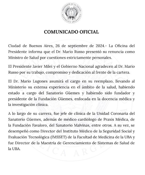 Aunque a la par, ya se presentó desde la Oficina del Presidente, también en la red X, el nombramiento de Mario Lugones como su reemplazo. A Lugones, se lo sindicó siempre como el «ministro en las sombras«, pero ahora finalmente parece que se le dará el respaldo oficial, al poder real que ya ejercía. Ver nombramiento