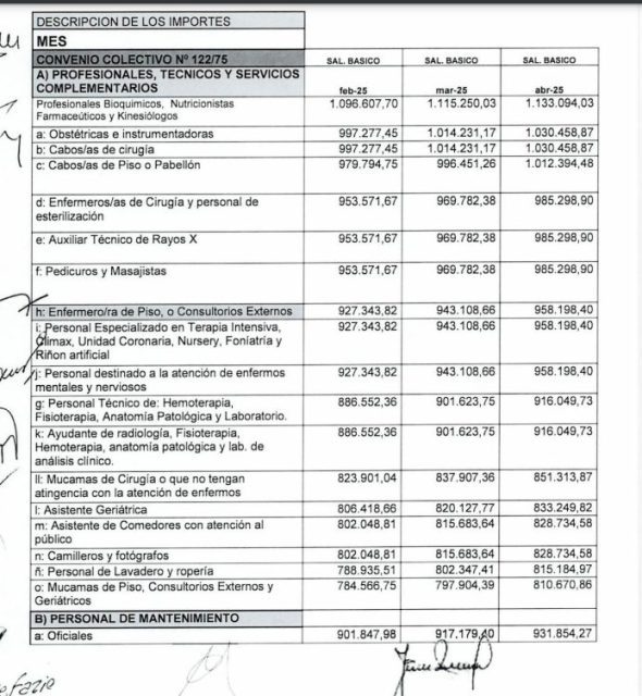 Uno de los convenios incluidos fue el que comprende a Institutos Médicos Odontológicos sin internación; Laboratorios Biológicos y de Análisis Clínicos, Rayos X, o similares, 108/75-. Los profesionales bioquímicos, nutricionistas y kinesiólogos percibirán una remuneración de $1.096.607,70 (u$s 1004,32) en febrero mientras que los trabajadores de Primera Categoría, $997.163,83 (u$s 913,25).