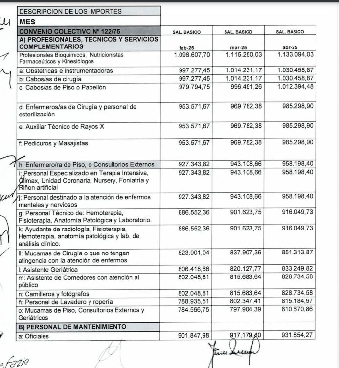 Uno de los convenios incluidos fue el que comprende a Institutos Médicos y Odontológicos sin internación; Laboratorios Biológicos y de Análisis Clínicos, Rayos X, o similares, 108/75-. Los profesionales bioquímicos, nutricionistas y kinesiólogos percibirán una remuneración de $1.096.607,70 (u$s 1004,32) en febrero mientras que los trabajadores de Primera Categoría, $997.163,83 (u$s 913,25).