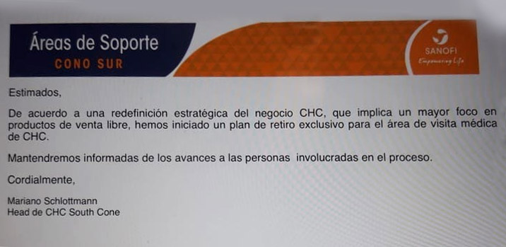 Sanofi no brindó precisiones sobre el detalle de la decisión. Sólo un escueto y telegráfico email interno en el que dijo: «De acuerdo a una redefinición estratégica del negocio CHC, que implica un mayor foco en productos de venta libre, hemos iniciado un plan de retiro exclusivo para el área de visita médica de CHC. Mantendremos informadas de los avances a las personas involucradas en el proceso». Ver email abajo
