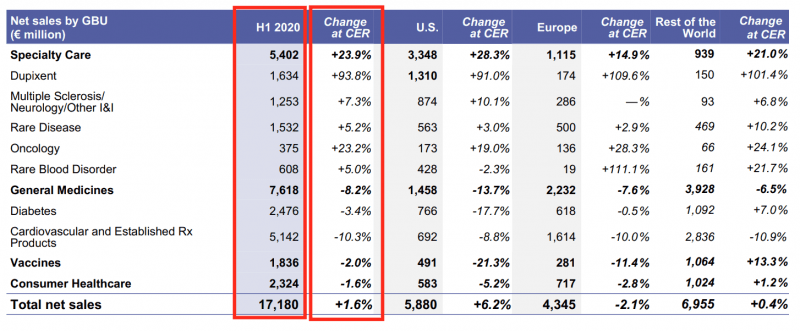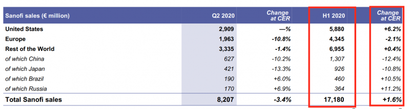 En este primer semestre del 2020 marcado por el COVID-19, la francesa Sanofi se salvó. Consignó que alcanzó ventas por € 17.180 millones, lo que significó un leve aumento del 1.6% frente al mismo período del 2019. Ver press release.