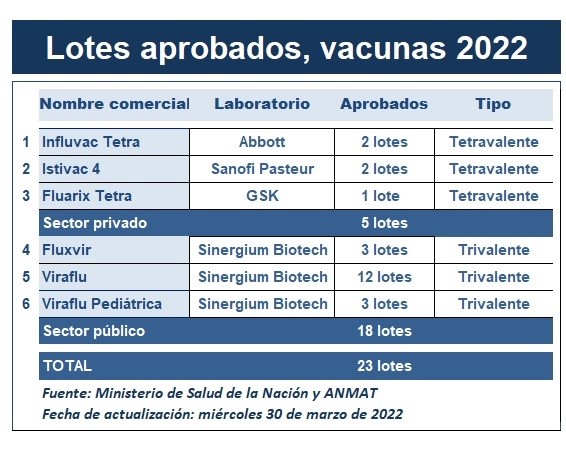 Para el sistema público, en tanto, se agregaron dos nuevas partidas de la trivalente Fluxvir, del consorcio Sinergium Biotech, aunque una de ellas quedó autorizada mediante la actualización del pasado miércoles 23 de marzo. Con esto, se totalizan 18 lotes destinados a ese circuito, de los cuales 12 corresponden a la vacuna Viraflu; tres a Fluxvir; y tres a la versión pediátrica de Viraflu.