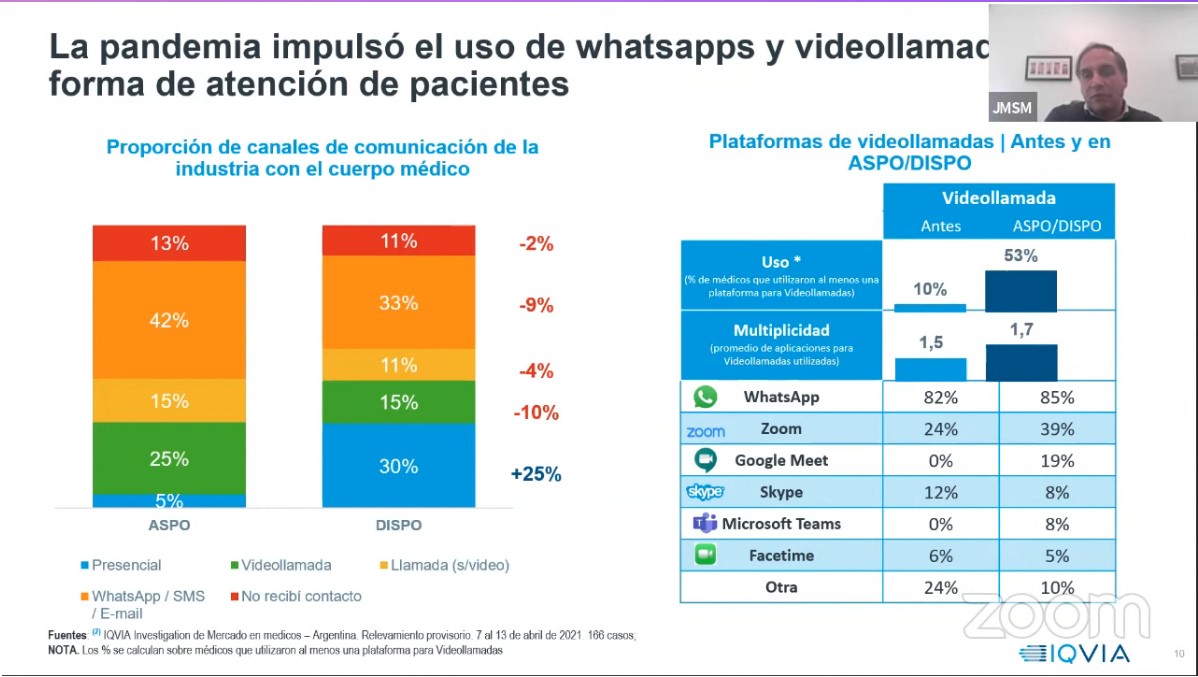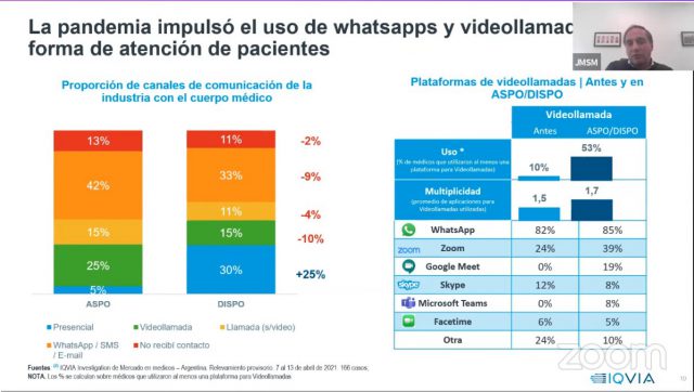 En paralelo, explicó que se observó un despegue de las plataformas electrónicas para la compra de productos en farmacias. Y en consonancia también se robustecieron las citas digitales entre profesionales y pacientes. En la conferencia, se desglosó el creciente nivel de uso del Whatsapp, el Zoom, Google Meet, el Facetime, entre otras herramientas en el ámbito asistencial.