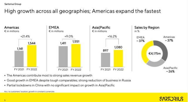 Sartorius registró un crecimiento significativo en el año en sus tres regiones comerciales. Los ingresos por ventas en EMEA, que contribuyeron con una participación del 37%, se incrementaron un 9,0% a €1.551 millones. La región Américas subió 21,4% a €1.544 millones, también con un aporte del 37% a la caja del Grupo. Por su parte, en  Asia/Pacífico la facturación ascendió un 16,2% a €1080 millones, equivalente al 26% de su facturación global.