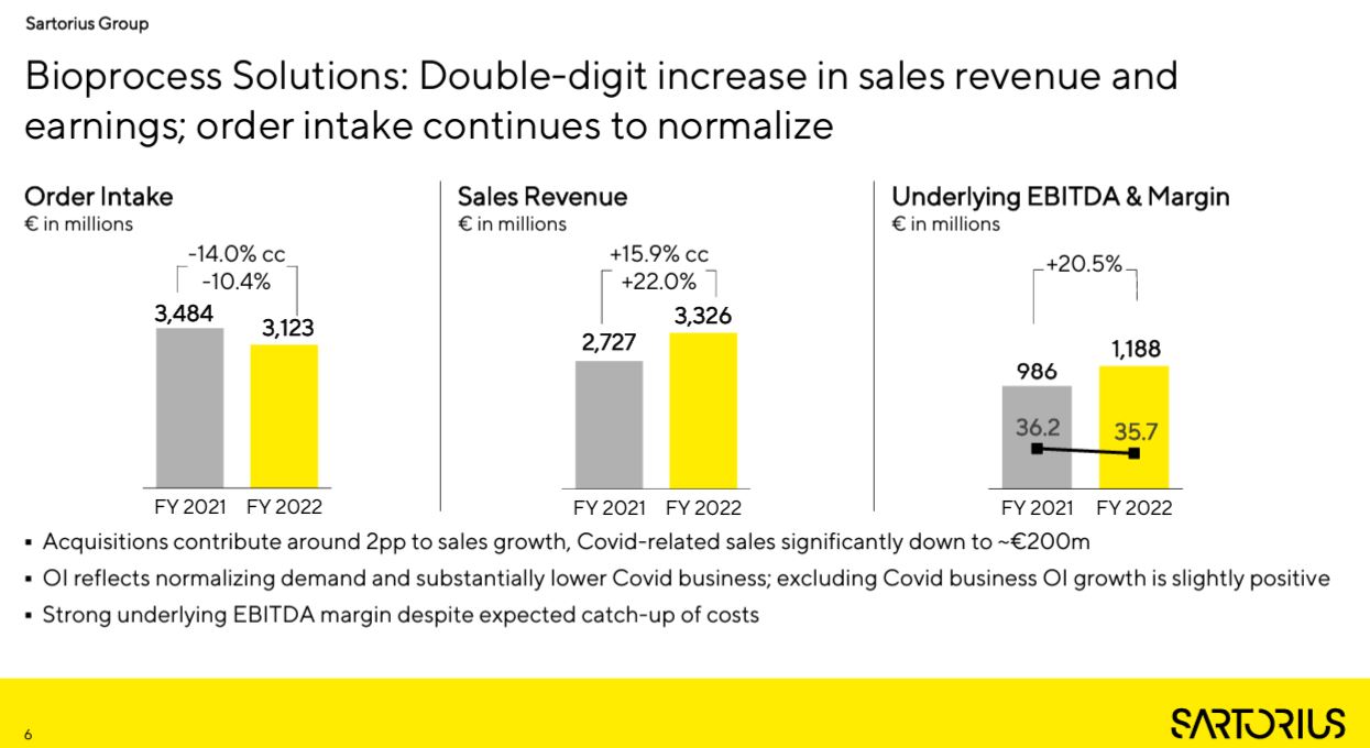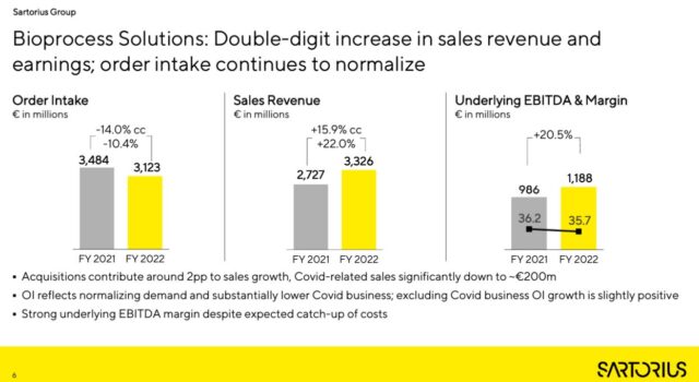 La demanda adicional relacionada con la pandemia, así como la excelente performance de sus recientes compras, impulsaron las ventas de la alemana Sartorius en 2022. Su facturación alcanzó a €4.174,7 millones, un 15,0% por encima del ejercicio previo medida en moneda constante. Ver Press Release.