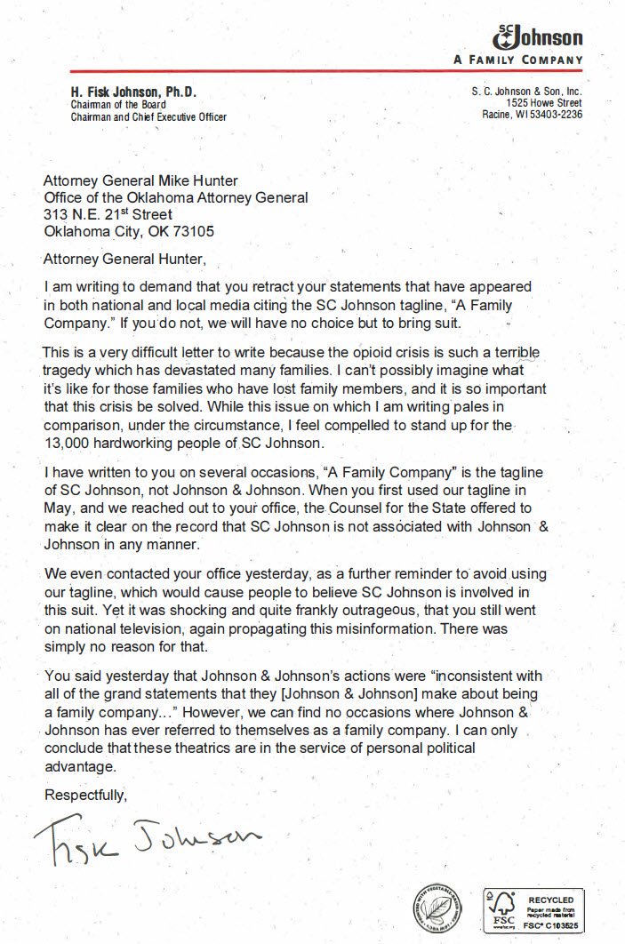 En la misma, Fisk Johnson solicita mediante su firma de puño y letra que el fiscal rectifique las declaraciones que realizó en los medios cuando trajo a colación el slogan «Una compañía familiar», el que es propiedad de SC Johnson. El funcionario lo había relacionado con el grupo J&J, el que está enfrentando una causa judicial que se dio en llamar «la crisis de los opioides». Ver carta.